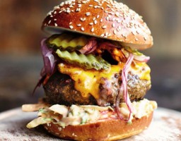 Made with handmade slaw iceberg lettuce salad freshly made from scratch, basted succulent burger patty, with a good cheese i.e. Emmental, Cheddar, Red Leicester melted over, a red onion pickle with gherkins in a toasted bun, served with tortilla chips (Please note we can offer vegetarian, vegan and gluten free options on request).